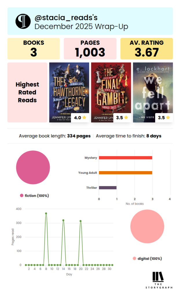 I don’t know yet about January. Let’s say 4 books, since I’ll start with my annual reread and I don’t expect it will take much longer to get through my current YA read. I’ll have my usual 2025 wrap-up/2026 reading goals post up soon.